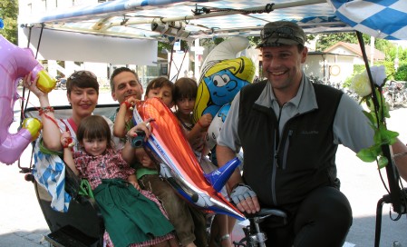 | Selbstdarstellung: | Ent-schleunigung auf 3 Rädern! bekannt als “Wadlkraft” fährt er seit 2006 mit einer Chinesischen Heck-Rikscha in München. Sie genießen die Fahrt auf Ihre weise, kulinarisch, kulturell, oder Streckenmäßig kann er entsprechende Touren für Sie zusammenstellen. Familien – mit quengelnden Kindern, großem Gepäck (Zwillings-Kinderwagen, Fahrrad) hat er schon oft mit seiner Individuellen Rikscha aus der Patsche geholfen. Mit dem Klappeinstieg können auch Behinderte gut einsteigen oder sich mit dem Rolli hinten an die Rikscha anhängen. Durch seine vielfältigen Kontakte schafft er es immer wieder spontan, Gruppenfahrten mit mehreren Rikschas zu organisieren. Mit seinem Motto “Abgefahren Ankommen” möchte er gerne seine Lebensfreunde an Sie weitergeben. Auf geht’s, buchen Sie und erleben Sie das kleine Glück des Alltags. |